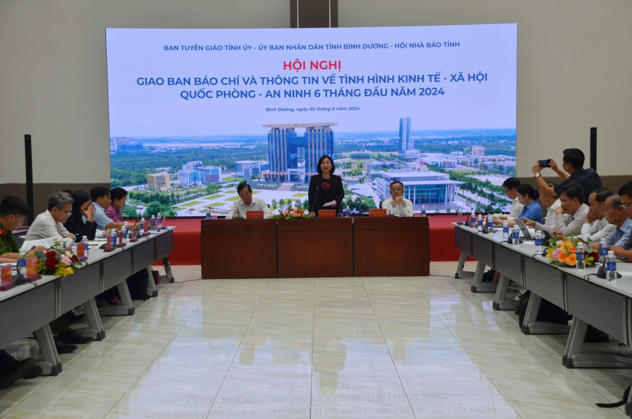 Chiều 2-8, UBND tỉnh Bình Dương tổ chức hội nghị giao ban báo chí và thông báo tình hình kinh tế – xã hội 6 tháng đầu năm 2024,và những trọng tâm các tháng cuối năm. Bà Trương Thị Bích Hạnh, Ủy viên Thường vụ, Trưởng Ban Tuyên giáo Tỉnh ủy; ông Võ Anh Tuấn, Chánh Văn phòng UBND tỉnh và ông Lê Hữu Phước, Chủ tịch Hội Nhà báo tỉnh cùng chủ trì họp báo, cùng các sở ban ngành tham dự.