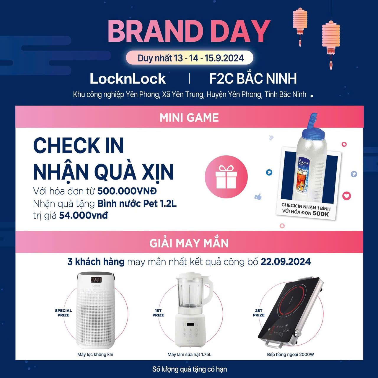 Brand Day- ngày hội mua sắm lớn nhất năm của LocknLock sẽ diễn ra chỉ trong ba ngày từ 13/09 – 15/09 tại gian hàng F2C Bắc Ninh, KCN Yên Phong, xã Yên Trung, huyện Yên Phong, tỉnh Bắc Ninh. Xuyên suốt sự kiện, khách hàng sẽ có rất nhiều cơ hội tận hưởng đại tiệc đồ gia dụng với giá ưu đãi đến 50%++, mua hàng đồng giá và nhận thêm vô vàn quà tặng hấp dẫn khác.