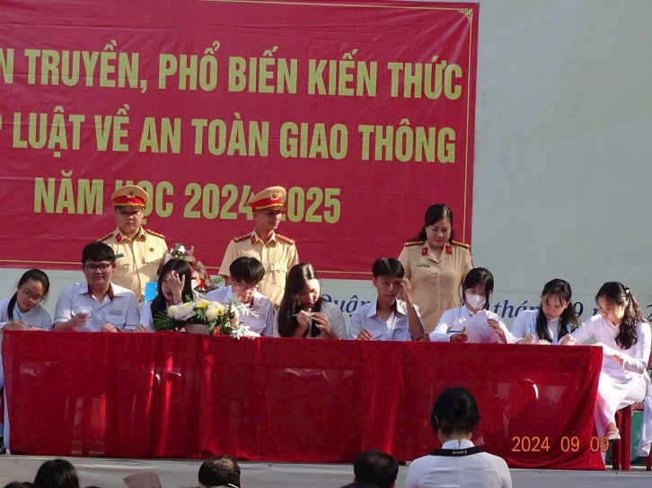 (Triển khai ký cam kết chấp hành nghiêm pháp luật giao thông với nhà trường, phụ huynh, học sinh).