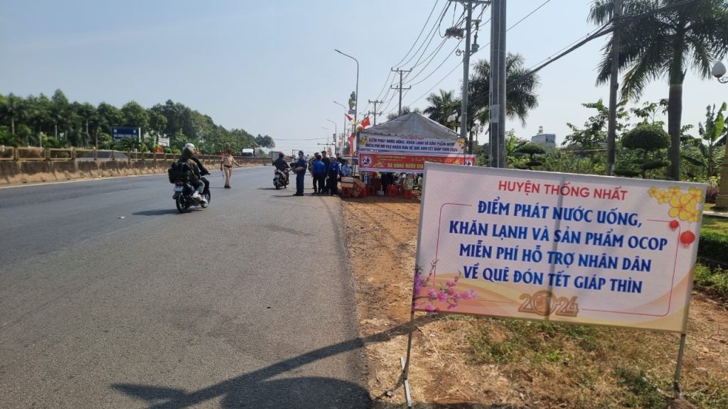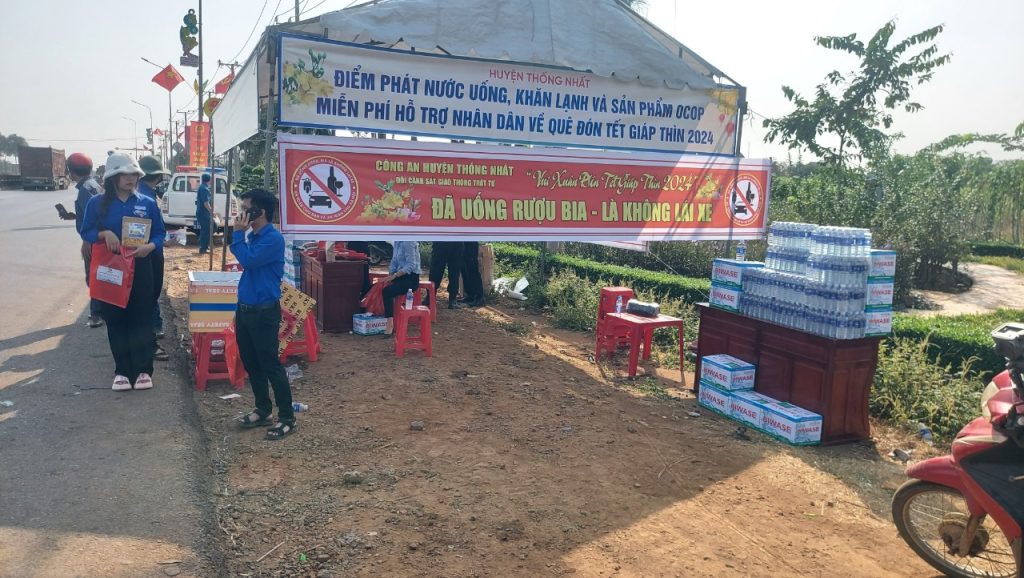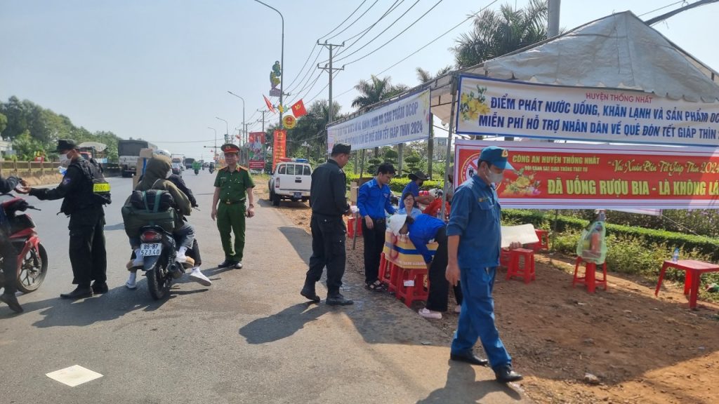 Công An và Các đoàn thể huyện Thống Nhất đã tổ chức phát nước, thực phẩm khô là những sản phẩm trong huyện sản xuất cho người đi đường để bảo đảm an toàn cho chuyến đi dài; các anh CSGT cũng thay nón miễn phí cho các lái xe đội nón BH kém chất lượng. Chương trình nầy sẽ được thức hiện tại huyện Thống Nhất 6 ngày : 3 ngày trước tết và 3 ngày sau tết. Thị trấn Dầu Giây là giao nhau của QL1A đi về miền Trung và QL20 đi về Lâm Đồng, Vì vậy CA và các đoàn thể phải chia thành 2 nhóm ở 2 hướng đường để phát nước và tuyên truyền an toàn giao thông. Mọi kinh phí do cán bộ Công An, UBND và các Mạnh thường quân đóng góp. Nhiều người dân Dầu Giây cũng đem nước đến hỗ trợ.