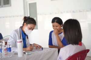 Tại đây, các em được các Y, Bác sĩ đo huyết áp, cân nặng, khám, chữa bệnh, cấp phát thuốc miễn phí.