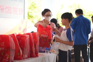 Ngoài khám, chữa bệnh, cấp phát thuốc miễn phí các em được nhận 300 phần quà của đoàn từ thiện Công ty Cổ phần Bibica.