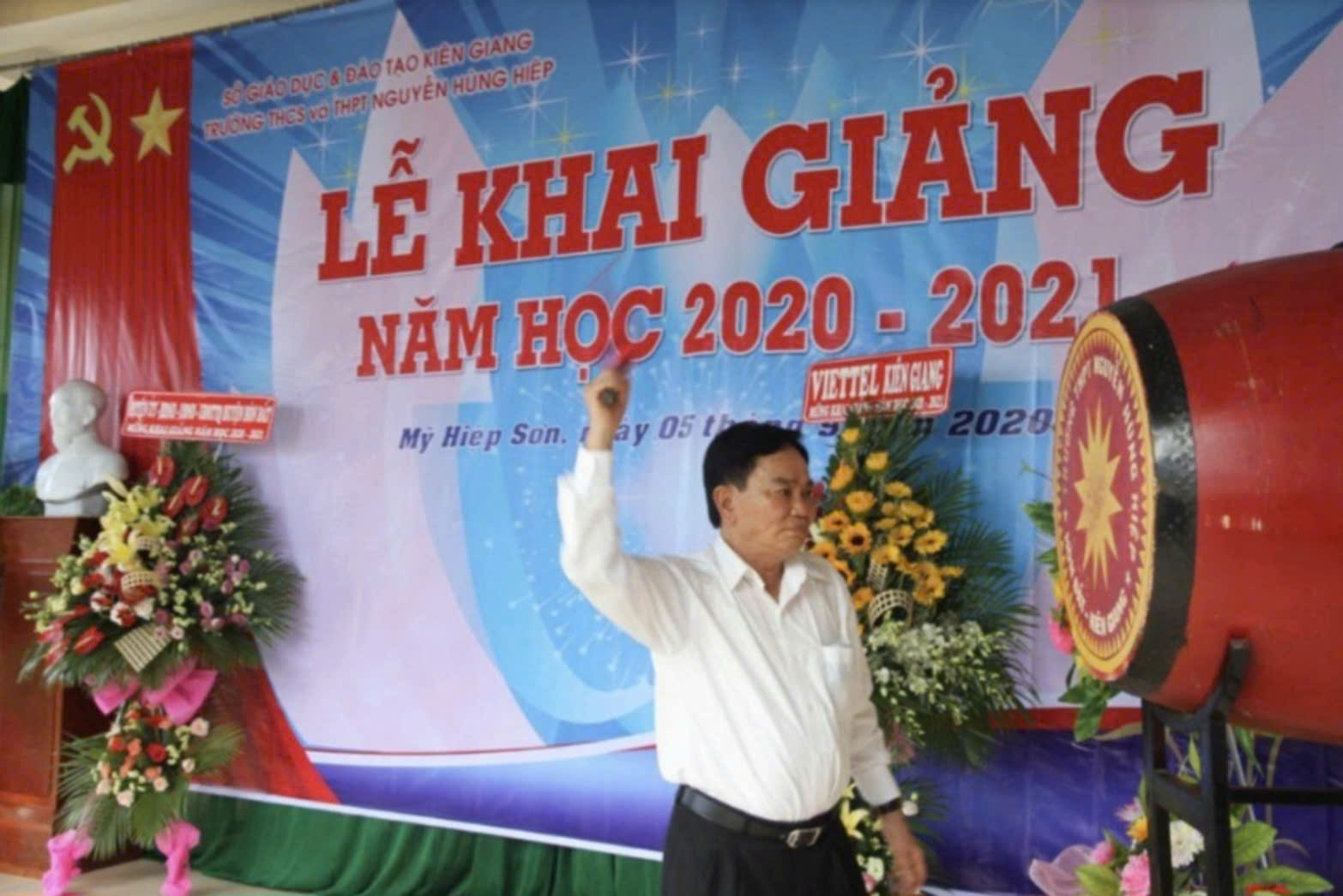 Nguyên Phó Tổng Thanh tra Chính phủ Nguyễn Chiến Bình đánh trống khai giảng tại Trường THPT Nguyễn Hùng Hiệp