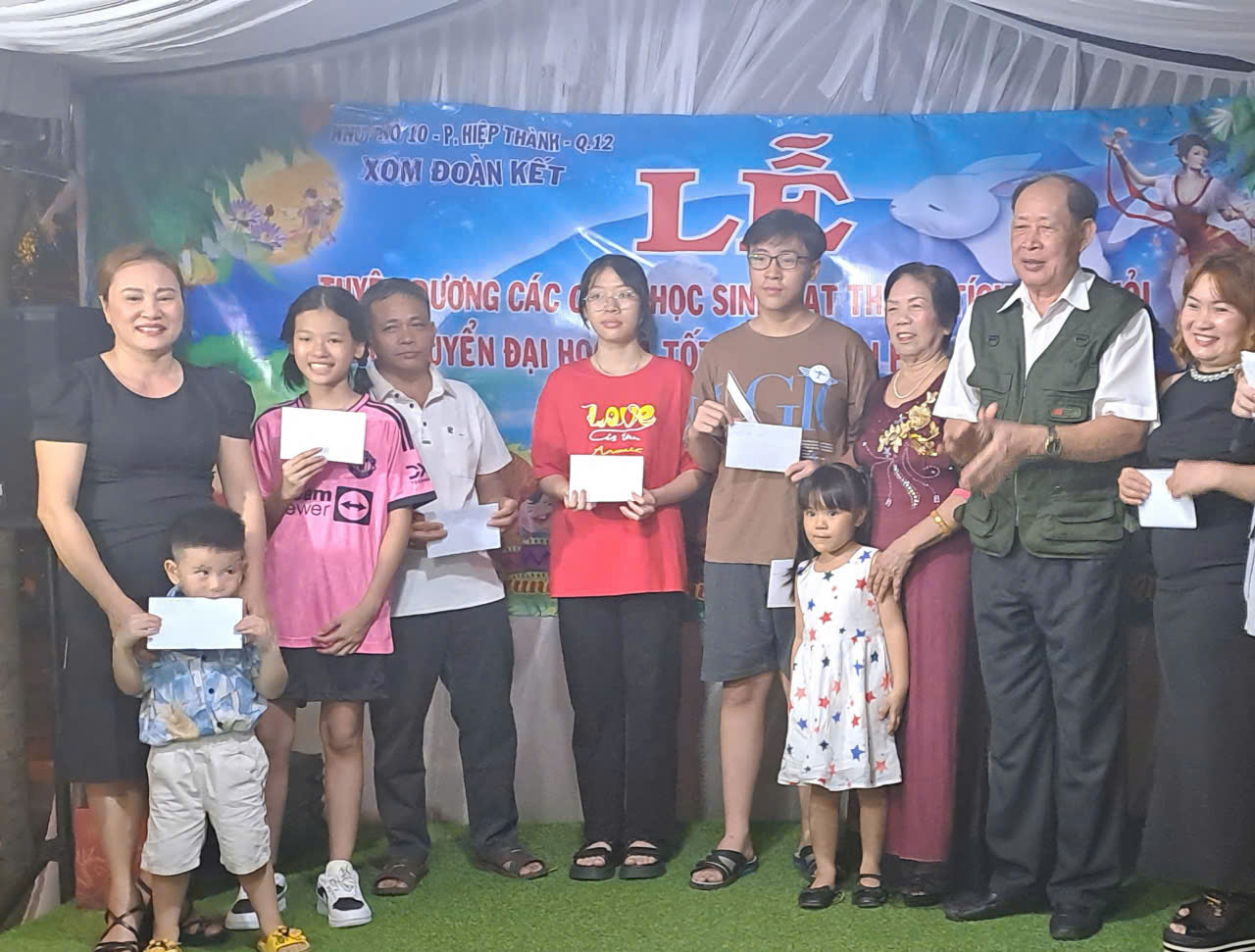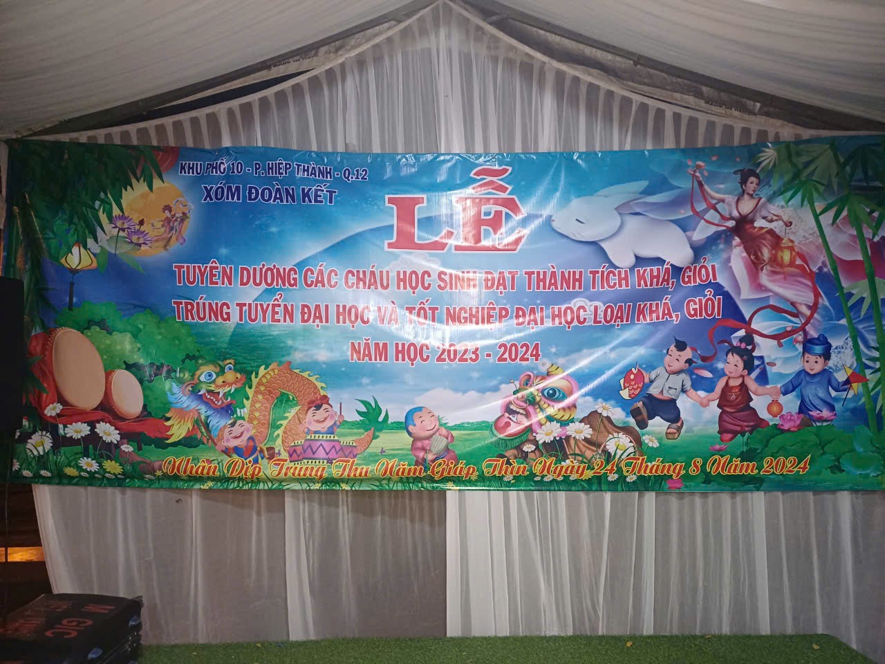 Cứ hằng năm vào ngày đầu năm học mới. Nhằm động viên, khuyến khích tinh thần cho con em xóm Đoàn Kết trong việc học tập. Ngày 24/8/2024 tại xóm Đoàn Kết, khu phố 10, Phường Hiệp Thành, Quận 12, TP. HCM. Tổ chức tuyên dương các cháu học sinh đạt thành tích khá, giỏi trong năm học 2023-2024; trúng tuyển đại học năm 2024 và tốt nghiệp đại học đạt loại khá, giỏi trong học tập. Qua đó trao tặng 34 phần quà cho: 28 em học sinh cấp 1,2,3; 03 em đỗ đại học và 03 em tốt nghiệp đại học. Bên cạnh đó xóm cũng đã phát 15 phần quà trung thu cho các cháu dưới 6 tuổi.