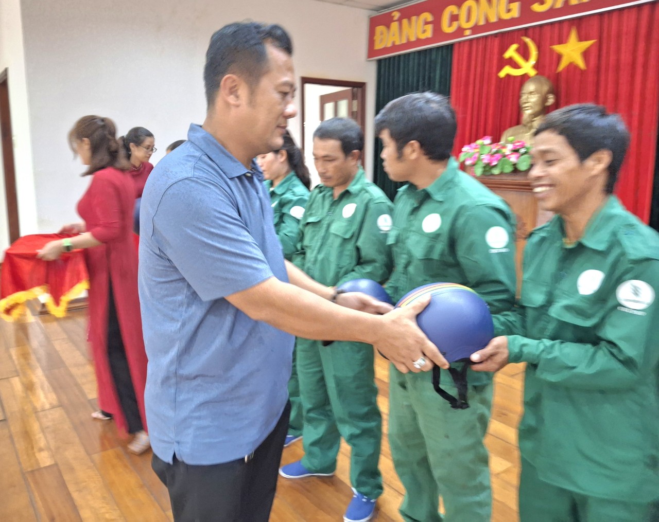 Ông Bùi Chí Cường, Giaothong 24h (áo xanh) và ông Đỗ Đăng Vỵ, Giaothong 24h trao nón bảo hiểm cho công nhân tại buổi giao lưu