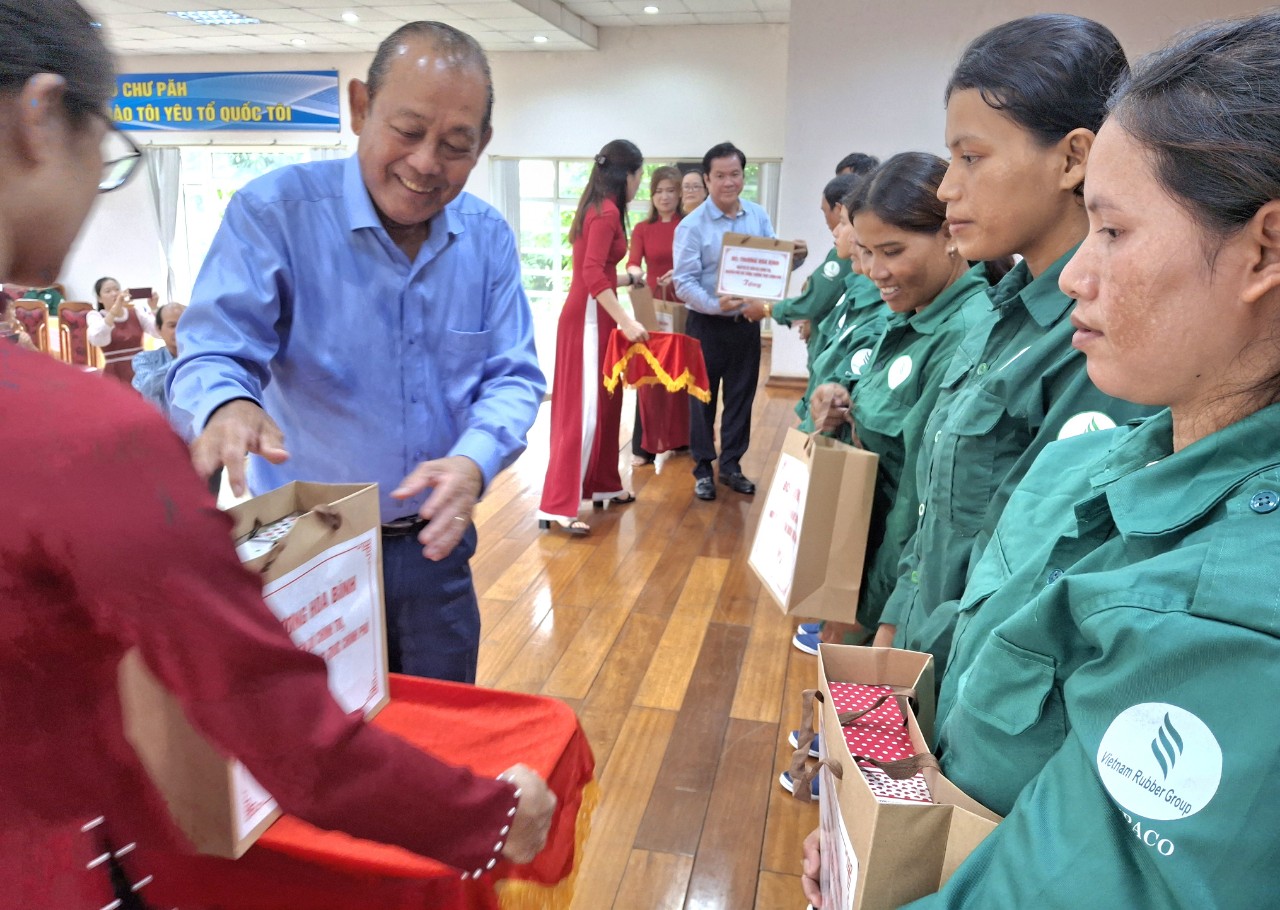 Ông Trương Hòa Bình, nguyên UV Bộ Chính trị, nguyên Phó Thủ tướng Thường trực Chính phủ trao tặng quà cho công nhân Công ty Cao su tại Chư Păh