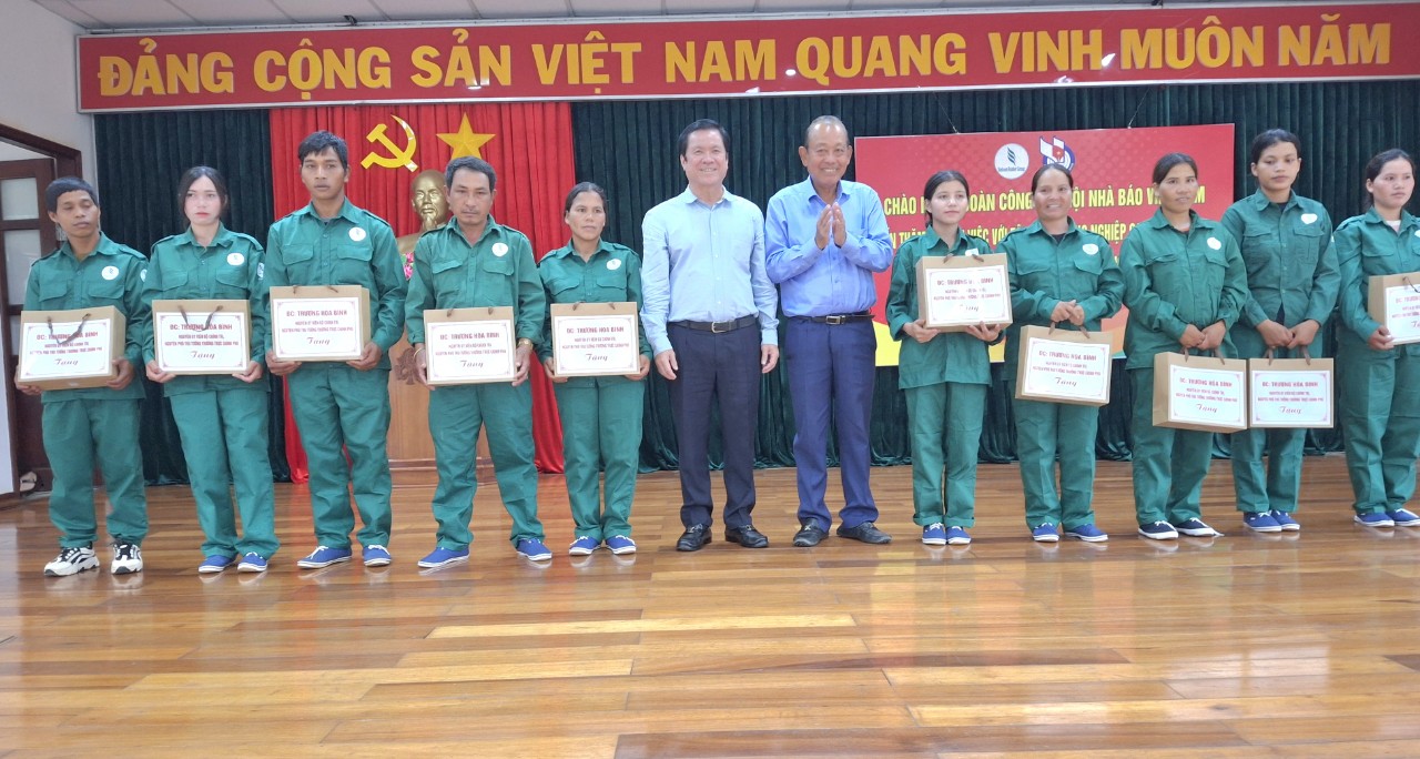 Ông Trần Trọng Dũng, Phó Chủ tịch Hội Nhà báo Việt Nam Phụ trách phía Nam và ông Phạm Đình Luyến Tổng Giám đốc Công ty Cao su Chư Păh trao tặng quà cho công nhân