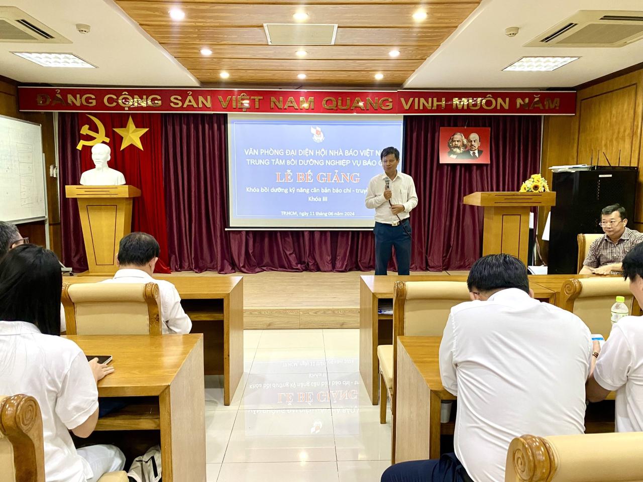 Chiều ngày 11/06/2024, Trung tâm bồi dưỡng nghiệp vụ báo chí (Hội Nhà báo Việt Nam) phối hợp với Văn phòng đại diện Hội Nhà báo Việt Nam tại TP. Hồ Chí Minh tổ chức Tổng kết khóa học kỹ năng nghiệp vụ báo chí năm 2024, tham dự có đồng chí Trần Trọng Dũng-Phó Chủ tịch Hội Nhà báo Việt Nam phụ trách phía Nam, cùng các nhà báo, giảng viên và gần 40 học viên.