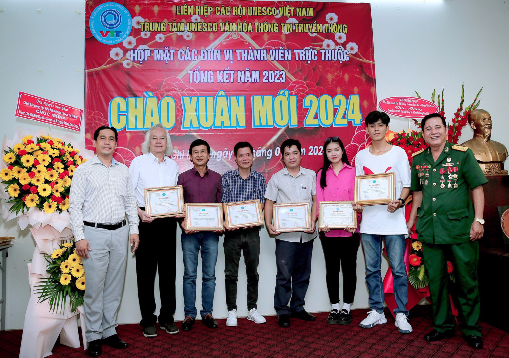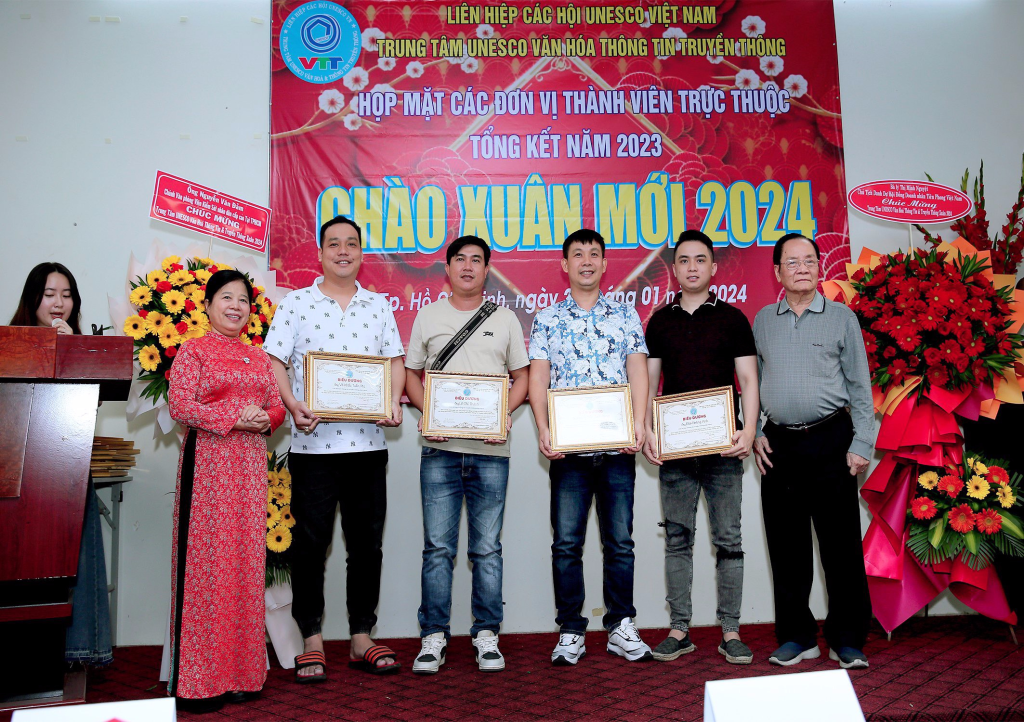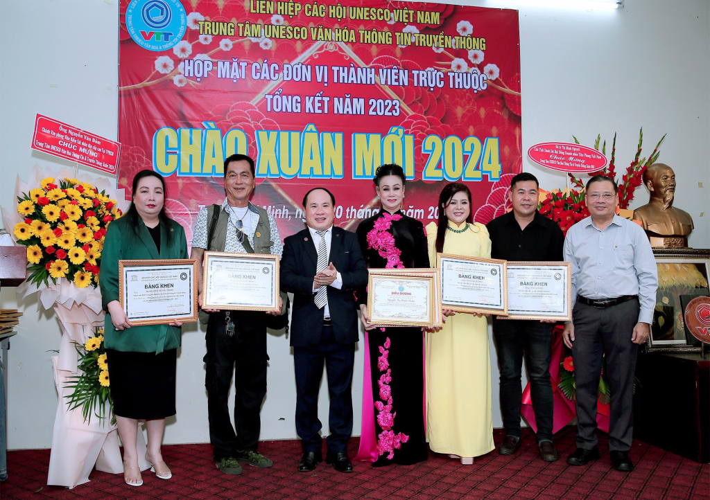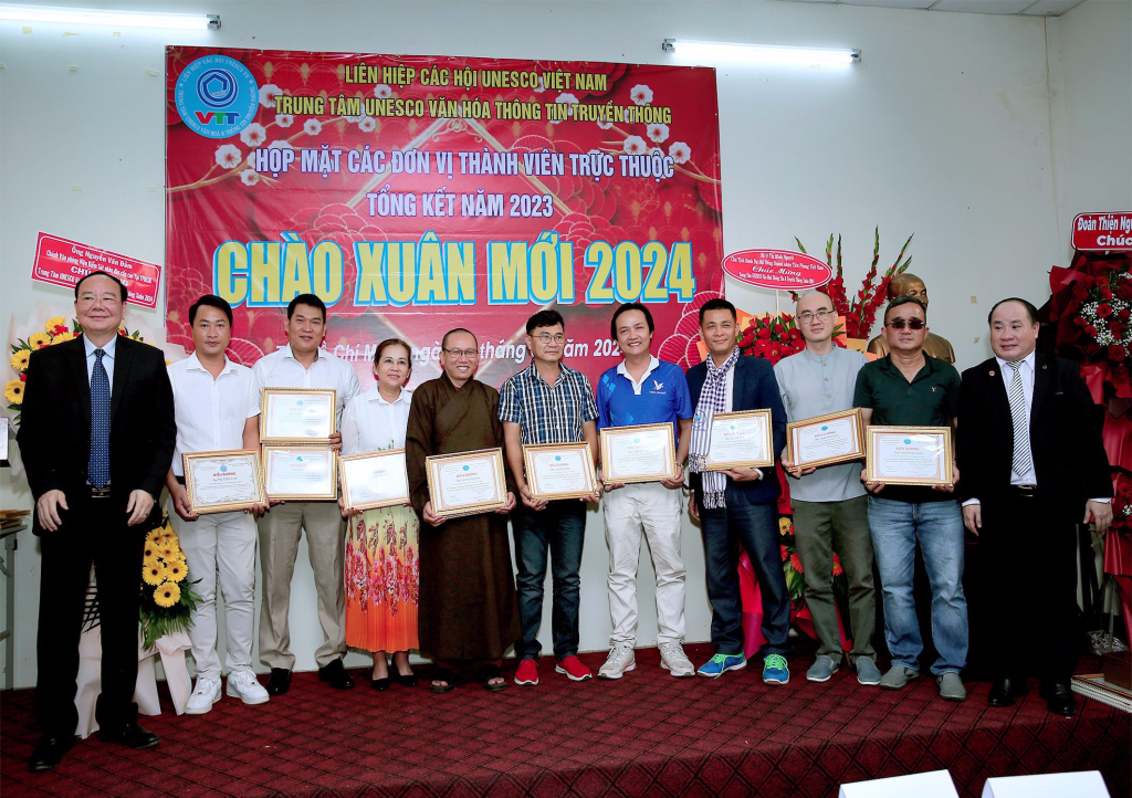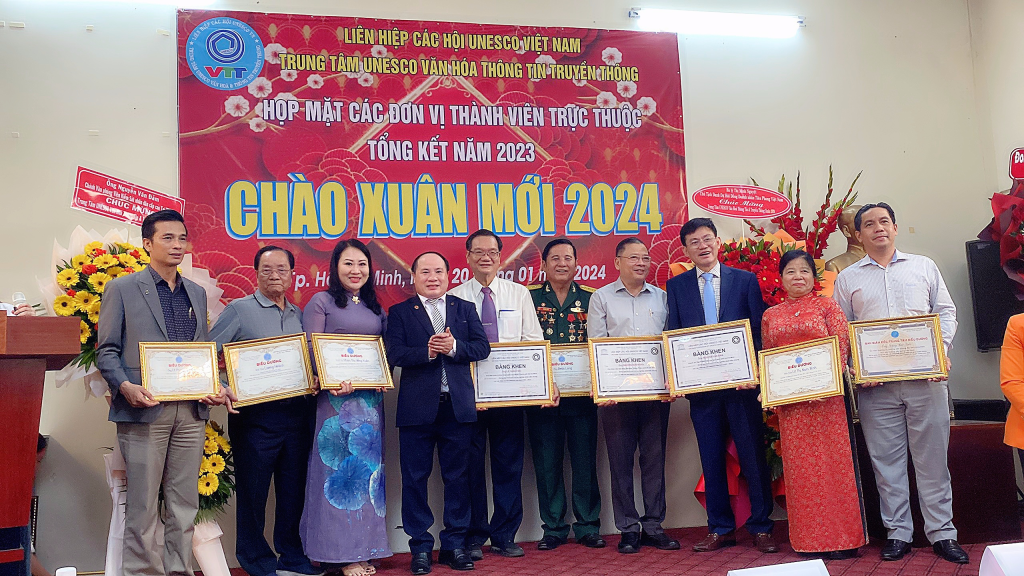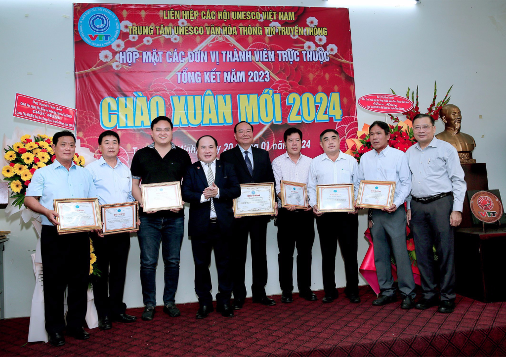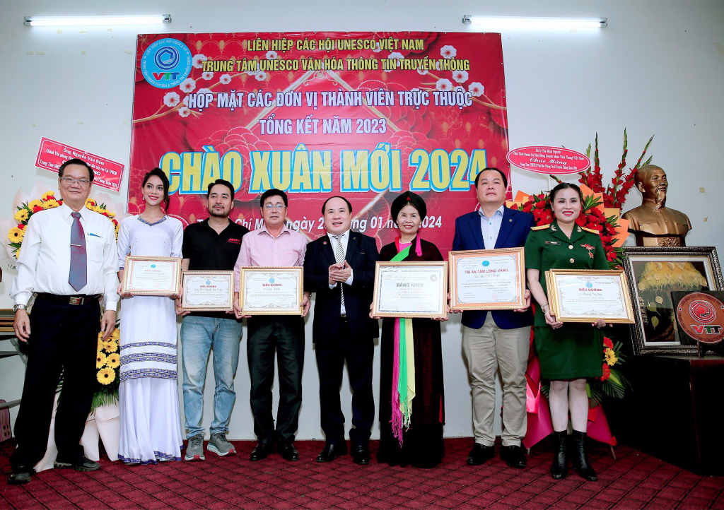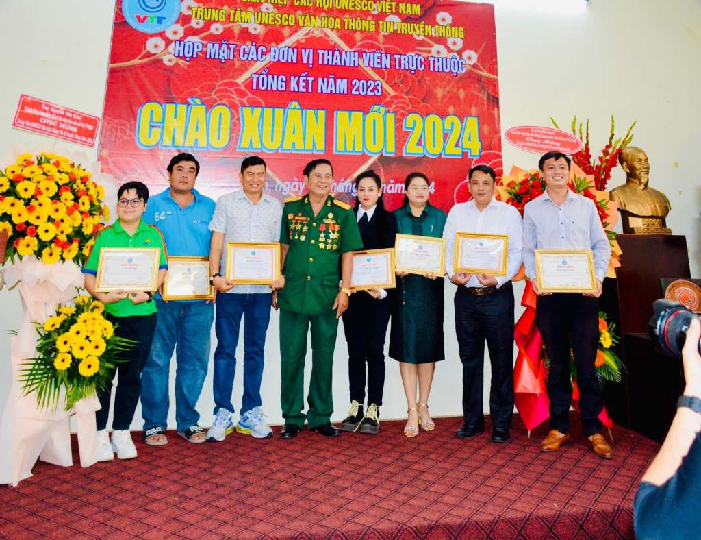 Vừa qua dịp kỷ niệm 30 năm thành lập Liên Hiệp Các Hội UNESCO Việt Nam, lãnh đạo Liên Hiệp đã xét tặng Bằng khen của Liên Hiệp cho Hội đồng tư vấn,Ban giám đốc,văn nghệ sĩ, cán bộ thành viên Trung Tâm UNESCO Văn Hoá Thông Tin Truyền Thông không có điều kiện ra Hà Nội nhận. Dịp này ông Phạm Đình Vương, Giám đốc Trung tâm UNESCO Văn Hoá Thông Tin Truyền Thông đã trao tặng Bằng khen của Liên Hiệp Các Hội UNESCO Việt Nam cho Hội đồng tư vấn,sứ giả Văn nghệ sĩ,cán bộ thành viên đóng góp tích cực cho sự phát triển chung của Liên Hiệp Các Hội UNESCO Việt Nam (1993-2023) và biểu dương các cán bộ, thành viên, Hội viên tiêu biểu có nhiều đóng góp tích cực hoạt động Trung Tâm thời gian qua.