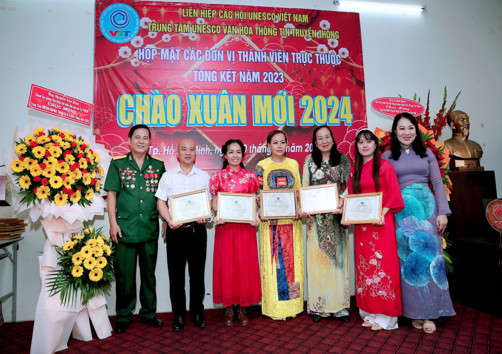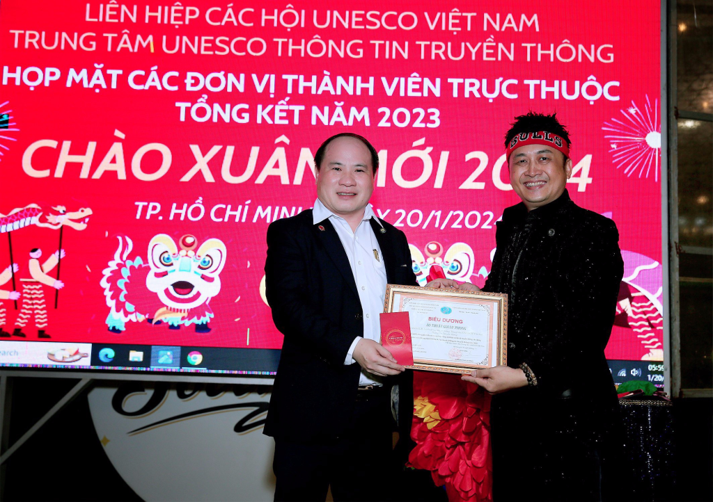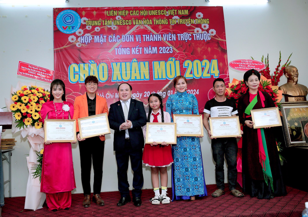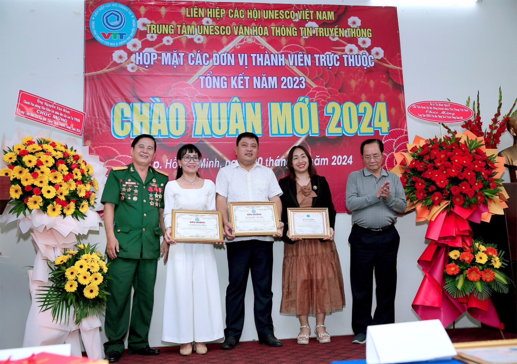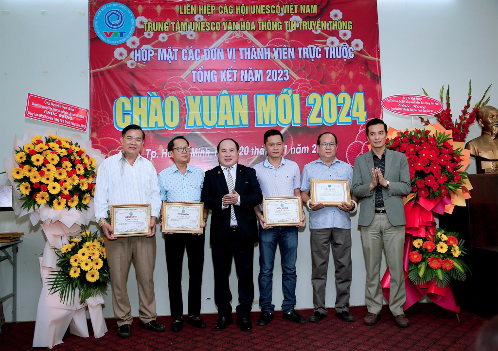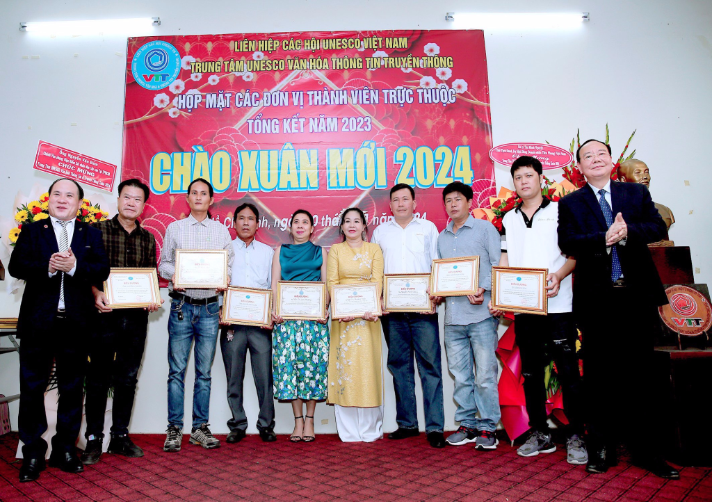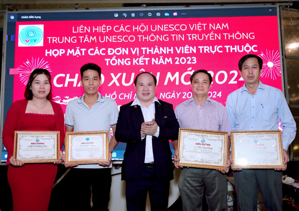Vừa qua dịp kỷ niệm 30 năm thành lập Liên Hiệp Các Hội UNESCO Việt Nam, lãnh đạo Liên Hiệp đã xét tặng Bằng khen của Liên Hiệp cho Hội đồng tư vấn,Ban giám đốc,văn nghệ sĩ, cán bộ thành viên Trung Tâm UNESCO Văn Hoá Thông Tin Truyền Thông không có điều kiện ra Hà Nội nhận. Dịp này ông Phạm Đình Vương, Giám đốc Trung tâm UNESCO Văn Hoá Thông Tin Truyền Thông đã trao tặng Bằng khen của Liên Hiệp Các Hội UNESCO Việt Nam cho Hội đồng tư vấn,sứ giả Văn nghệ sĩ,cán bộ thành viên đóng góp tích cực cho sự phát triển chung của Liên Hiệp Các Hội UNESCO Việt Nam (1993-2023) và biểu dương các cán bộ, thành viên, Hội viên tiêu biểu có nhiều đóng góp tích cực hoạt động Trung Tâm thời gian qua.