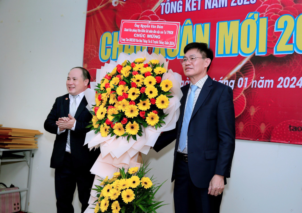 Ông Nguyễn Văn Đảm, Chánh Văn Phòng Viện KSND Cấp Cao Tại TP. HCM, Hội đồng cố vấn Trung Tâm UNESCO Văn hoá Thông tin Truyền thông tặng hoa cho ông Phạm Đình Vương,Giám đốc Trung tâm UNESCO Văn hoá Thông tin Truyền thông.