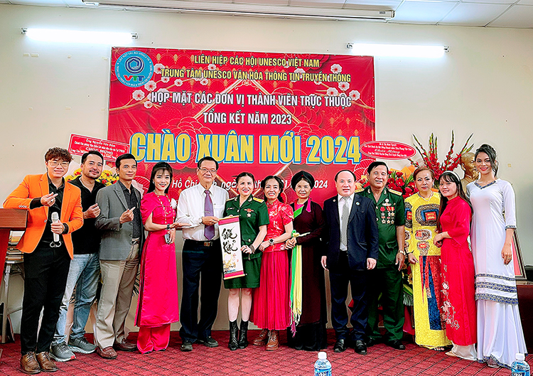 MC – NS Thanh Bạch, Sứ giả Trung tâm và Hội đồng tư vấn – Ban giám đốc- Ban tổ chức chương trình khai tiệc tất niên chào Xuân 2024 của Trung Tâm UNESCO Văn hoá Thông tin Truyền thông.
