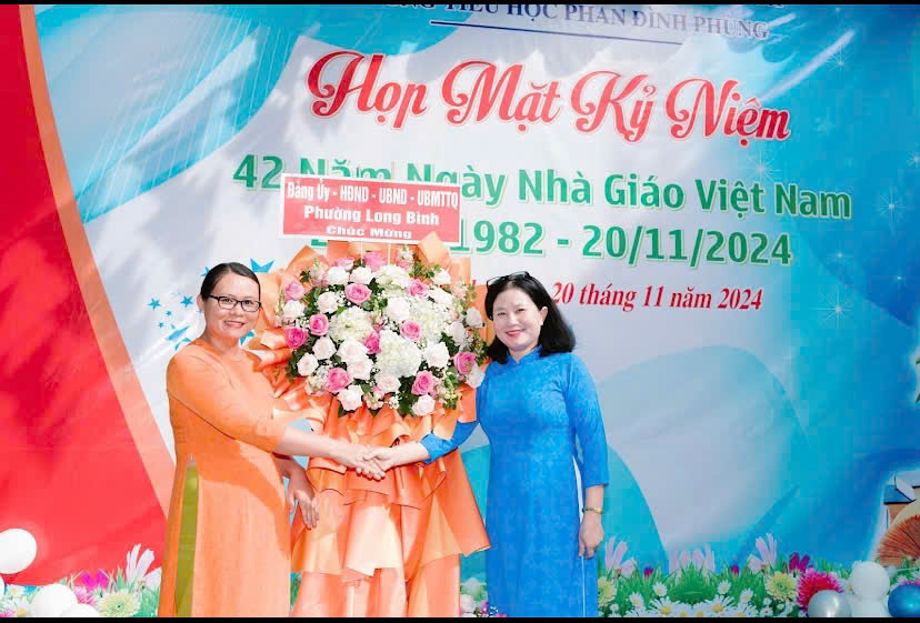 Bà Phạm Thị Hồng Thắm, Phó Chủ tịch HĐND phường Long Bình (bìa trái) tặng hoa chúc mừng Ngày Nhà giáo Việt Nam 20/11 tại Trường Tiểu học Phan Đình Phùng.