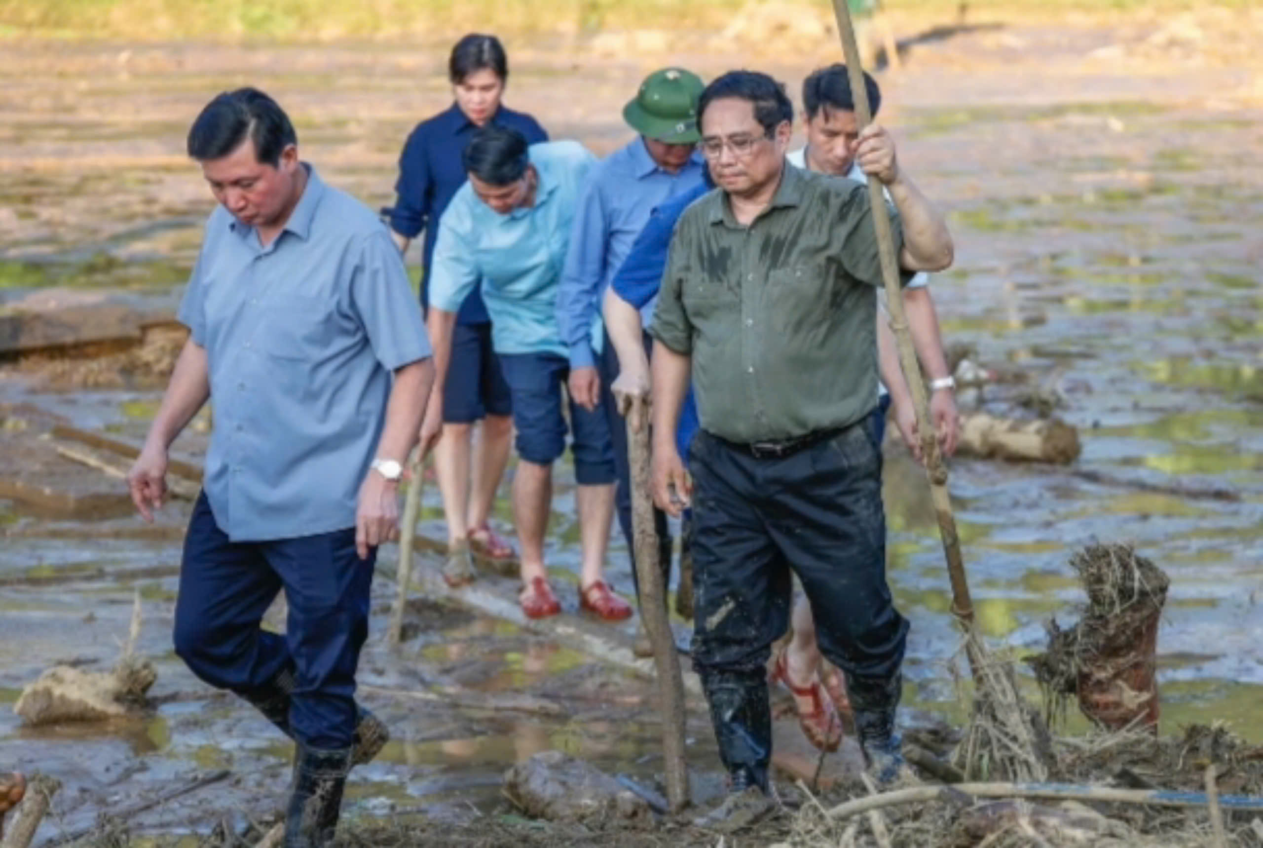 Thủ tướng Phạm Minh Chính cùng đoàn công tác trực tiếp vào khu vực hiện trường, để tìm kiếm nạn nhân mất tích tại Làng Nủ.